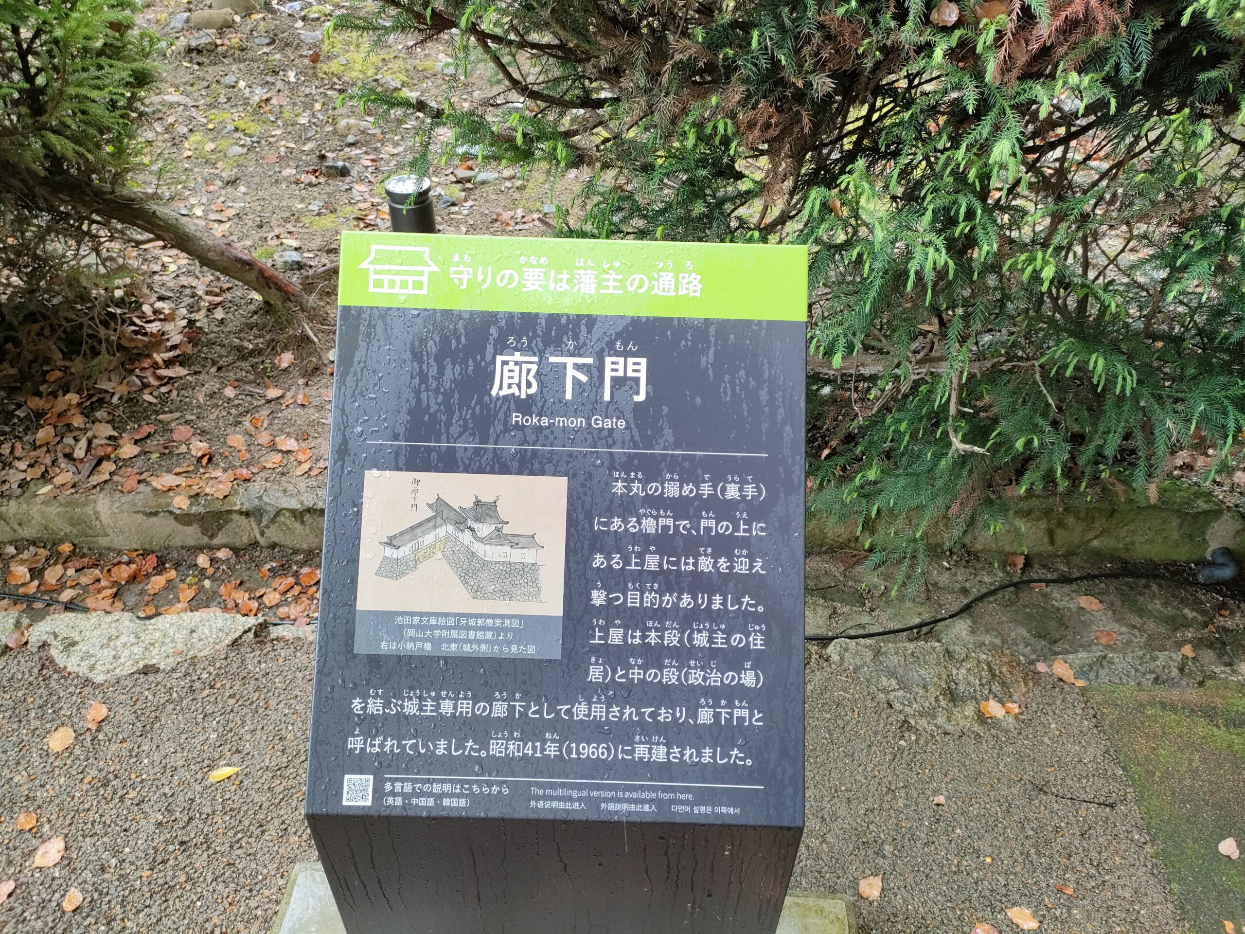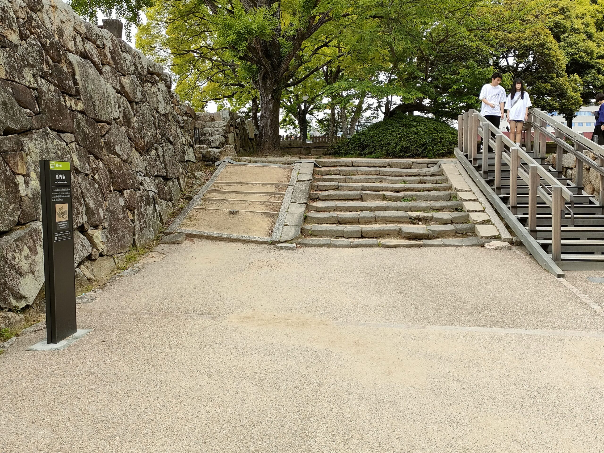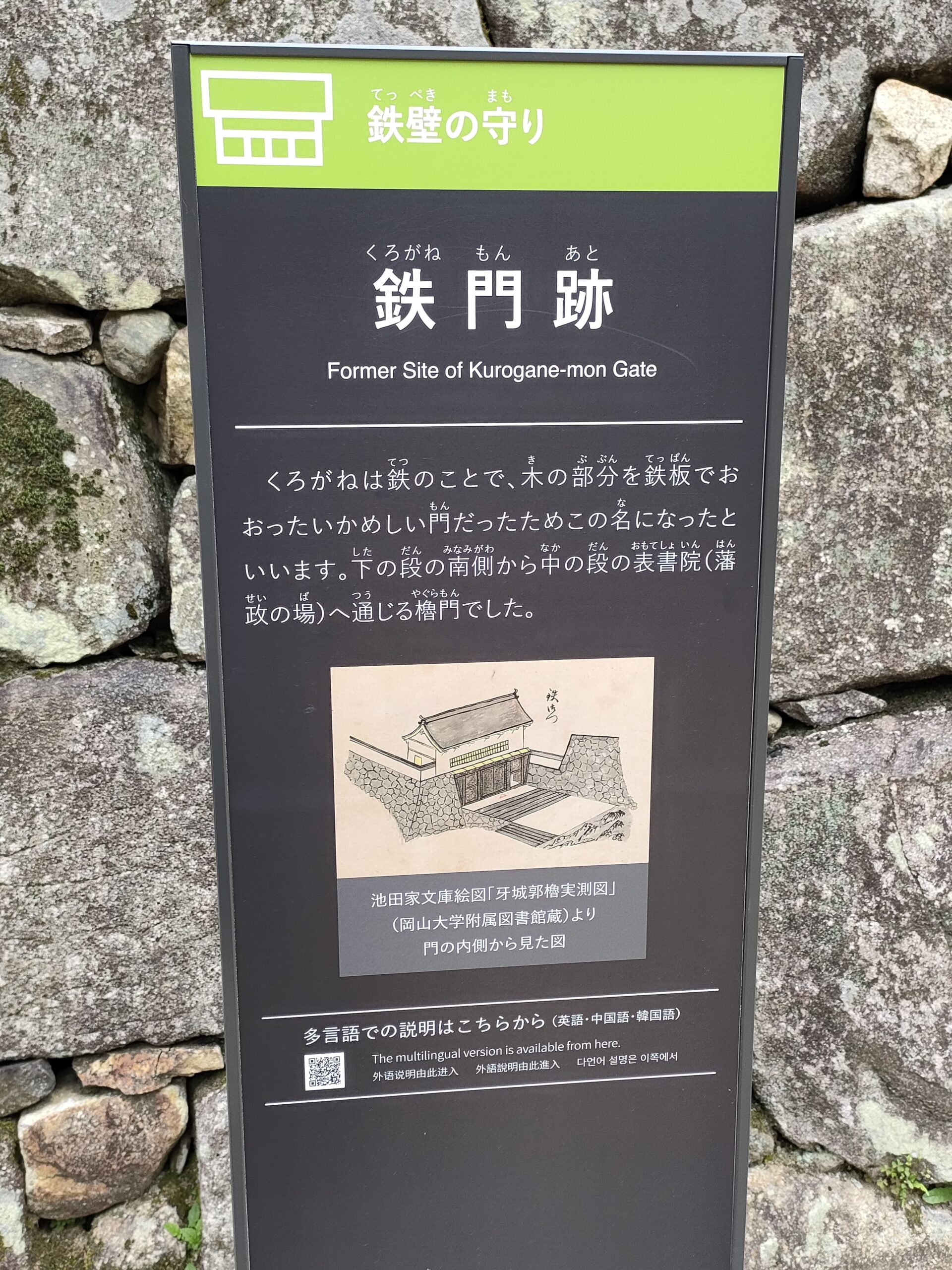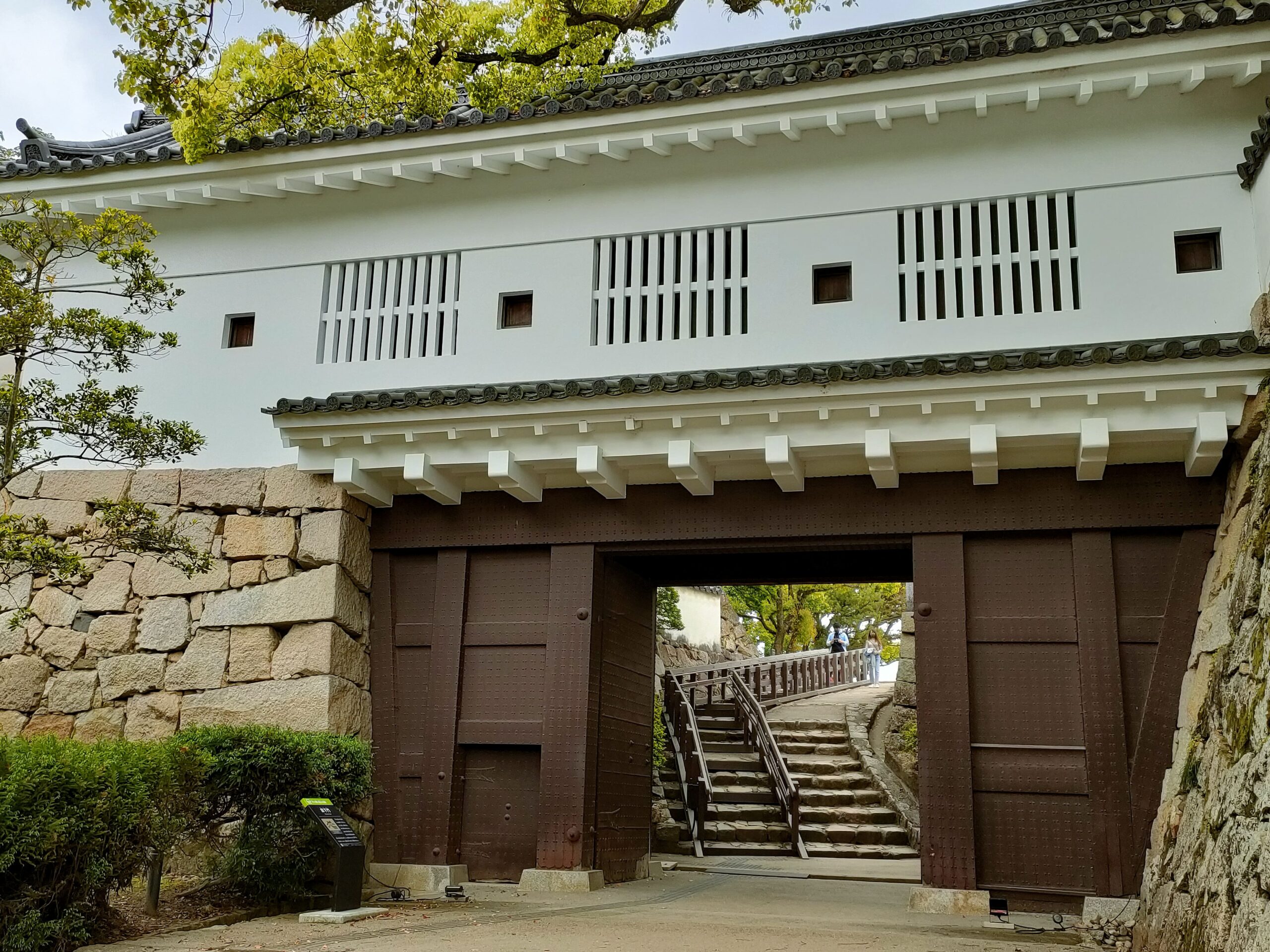 鉄門跡から中の段に入り散策。国指定重要文化財である月見櫓、宇喜田時代の石垣を拝見。中の段をあちらこちらと散策させてもらいました。そして見上げると天守がもうすぐそこに。上の段へと続く不明門に向かいました。本段には藩主が暮らしごく限られた人しか入ることができず、この門は普段は閉ざされていたそうです。だからこの門の名は「不明門」。立派すぎるくらい立派な大きな門です。