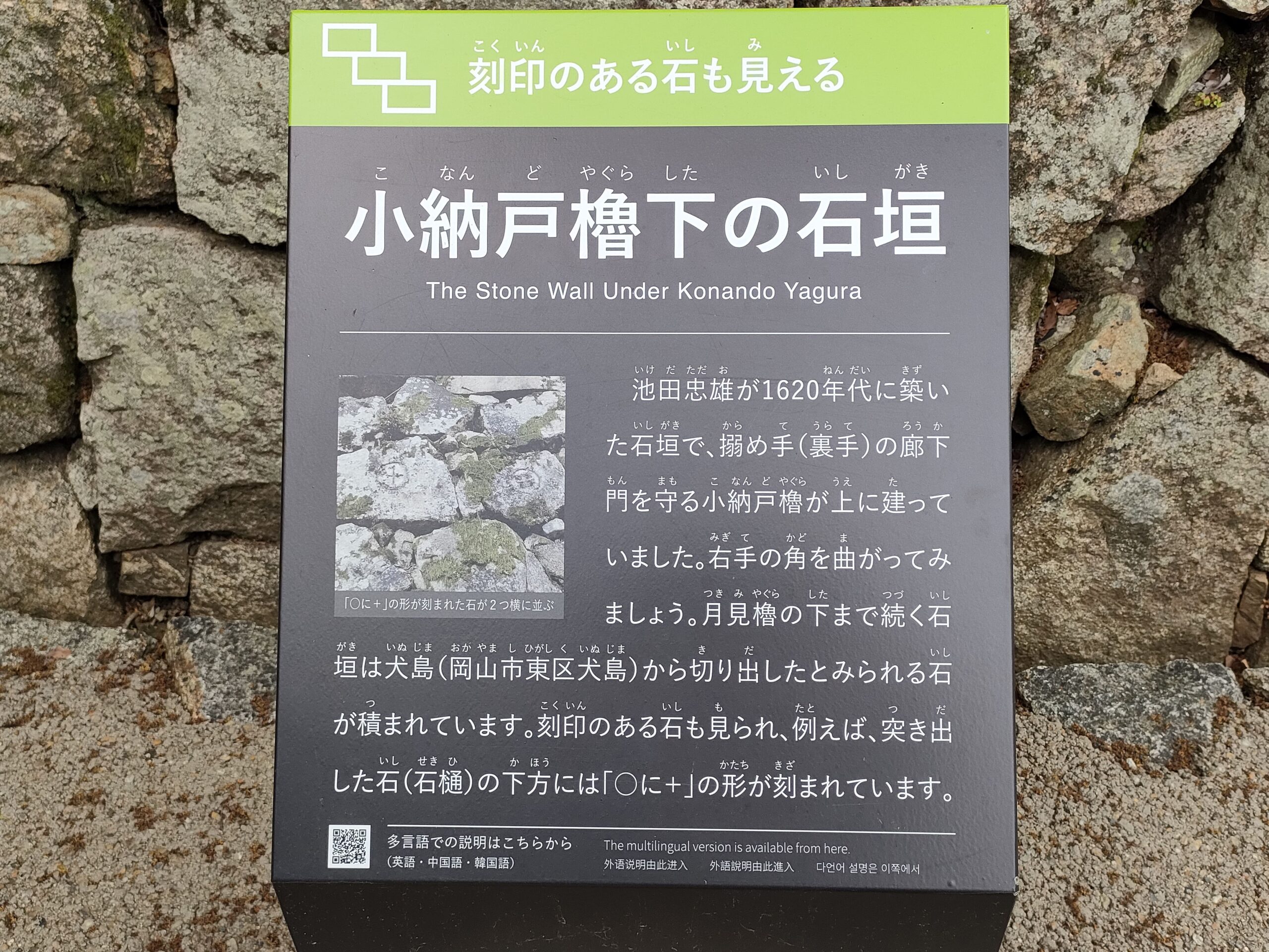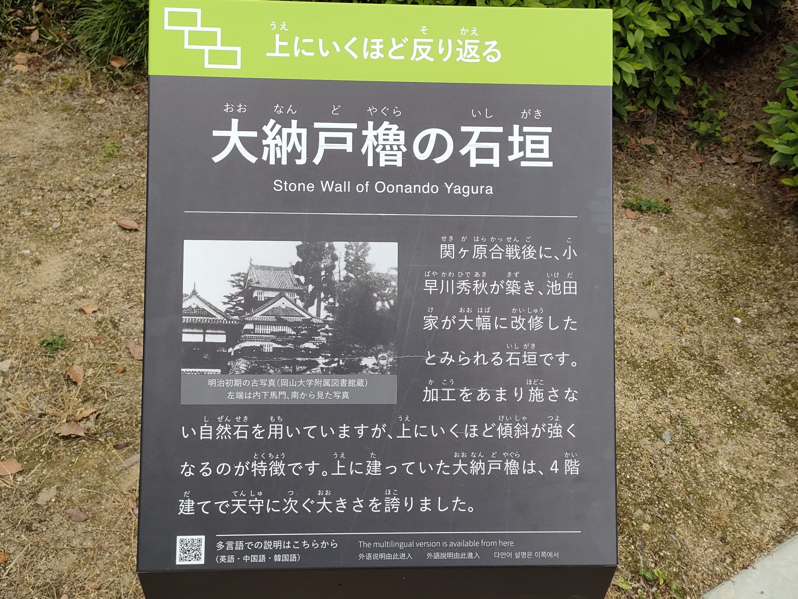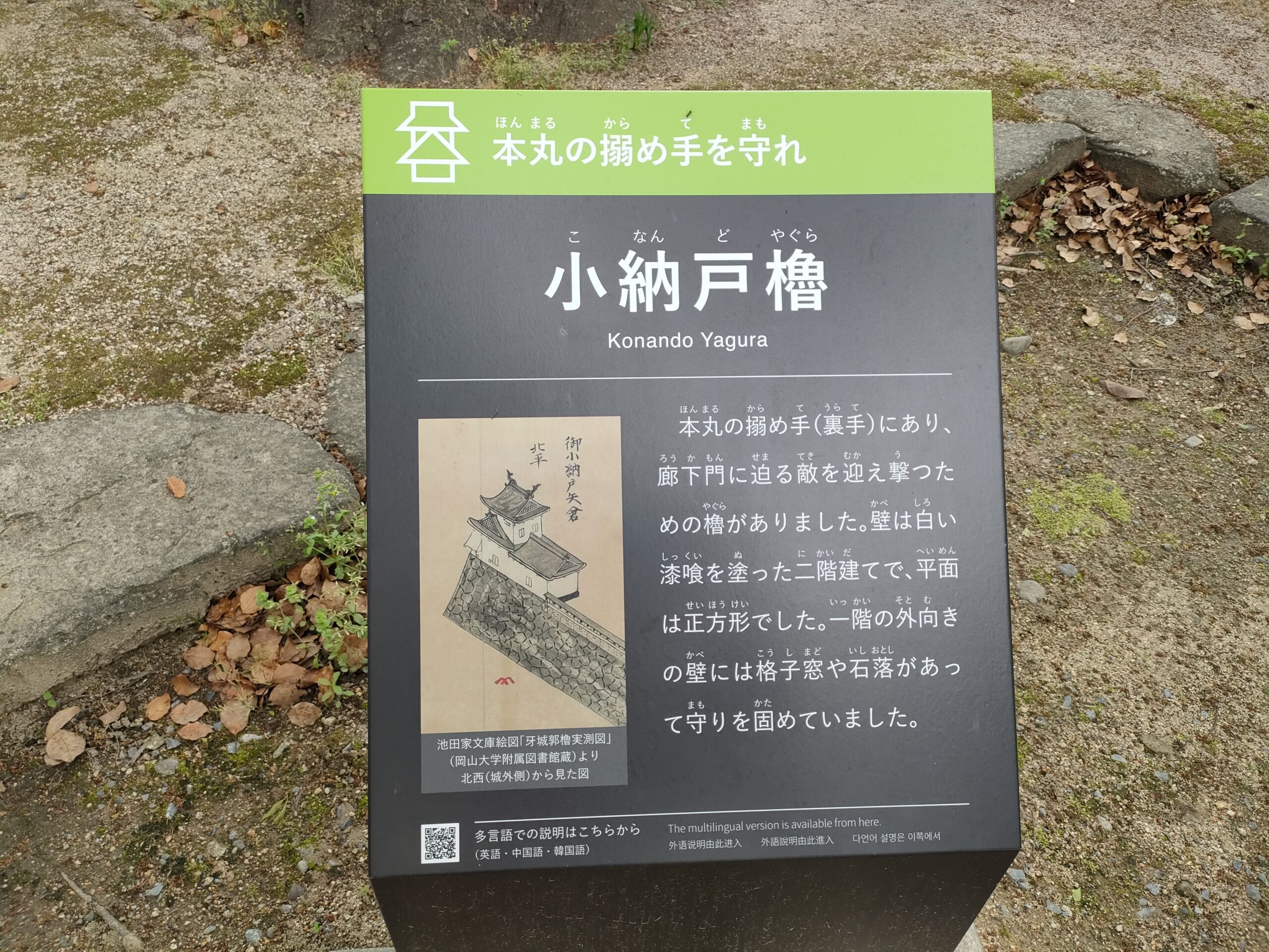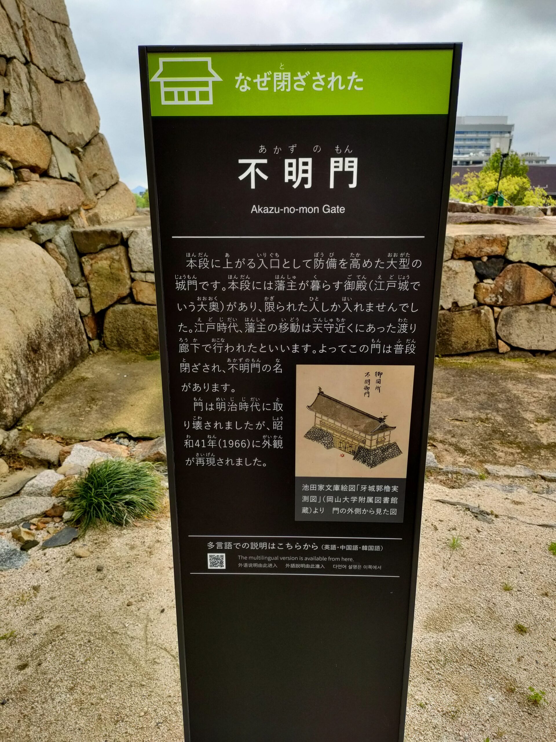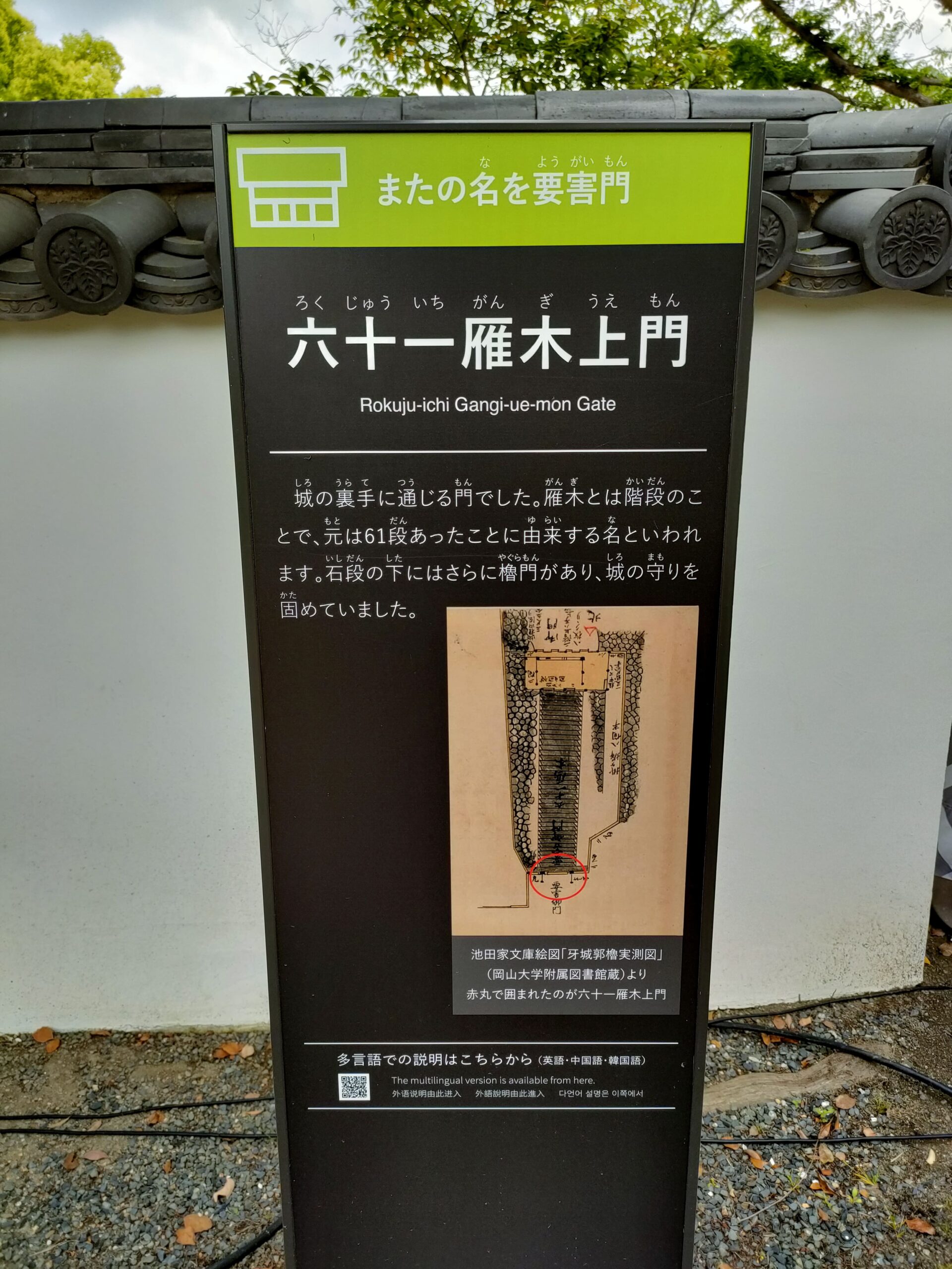 鉄門跡から中の段に入り散策。国指定重要文化財である月見櫓、宇喜田時代の石垣を拝見。中の段をあちらこちらと散策させてもらいました。そして見上げると天守がもうすぐそこに。上の段へと続く不明門に向かいました。本段には藩主が暮らしごく限られた人しか入ることができず、この門は普段は閉ざされていたそうです。だからこの門の名は「不明門」。立派すぎるくらい立派な大きな門です。