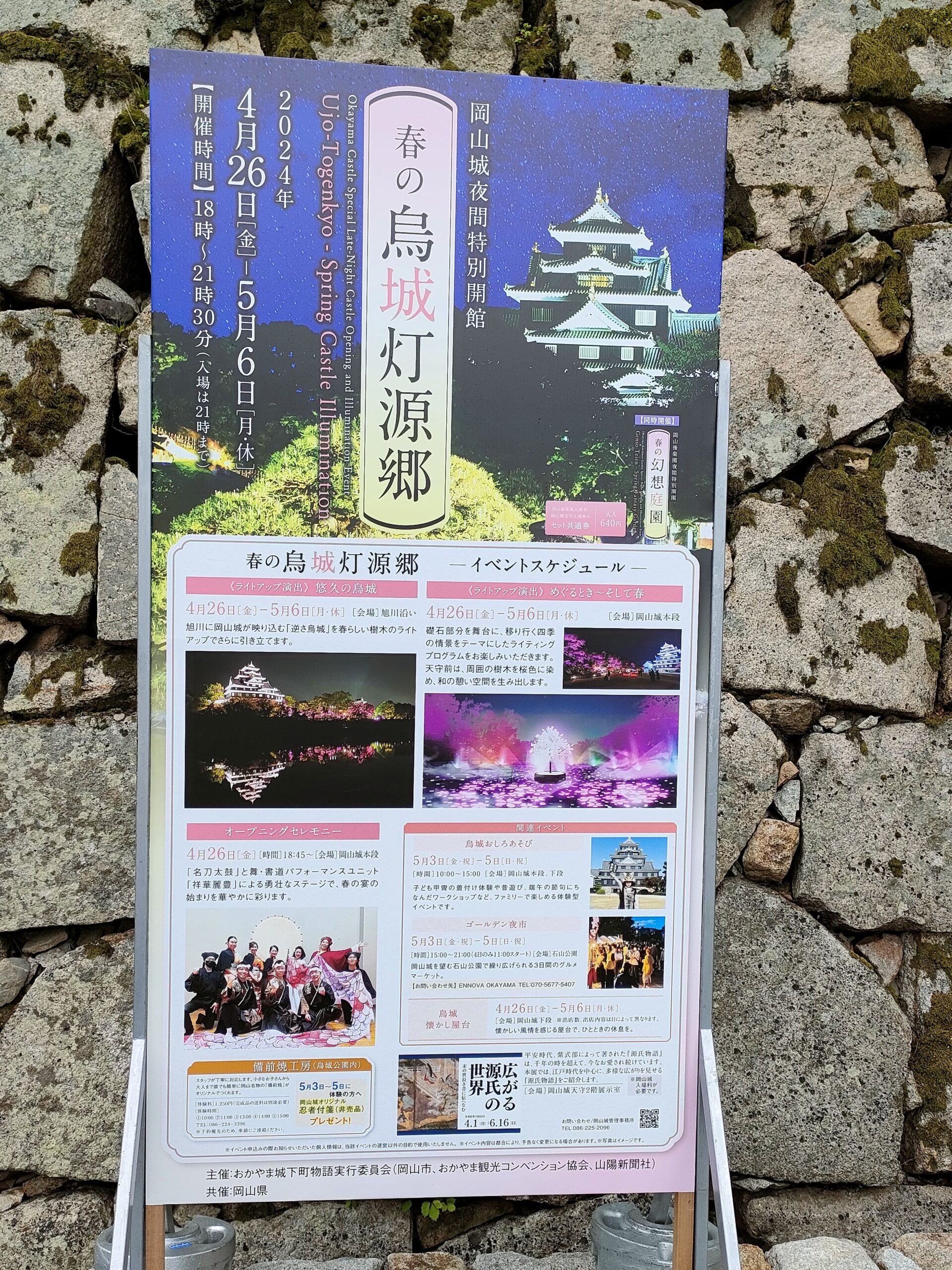 岡山城内では、殿様の羽織を着衣させてもらいました。たまたま居合わせた多くの外人さんに写真を撮られ少し恥ずかしかったです(苦笑)。白を基調とした紋付き袴姿で扇をもって記念撮影。とても見せられたものではありませんので、ここではお披露目はありません(笑)
