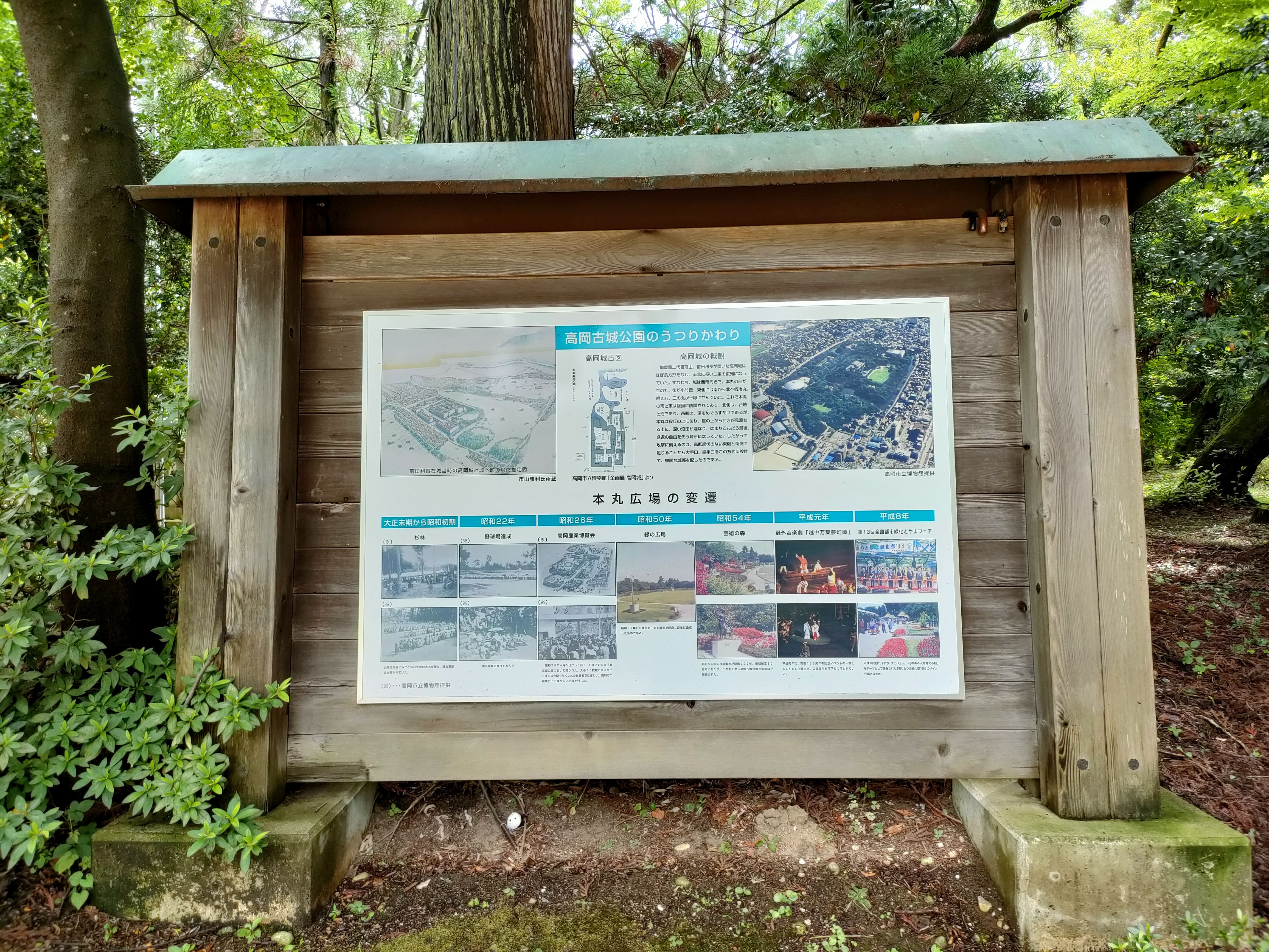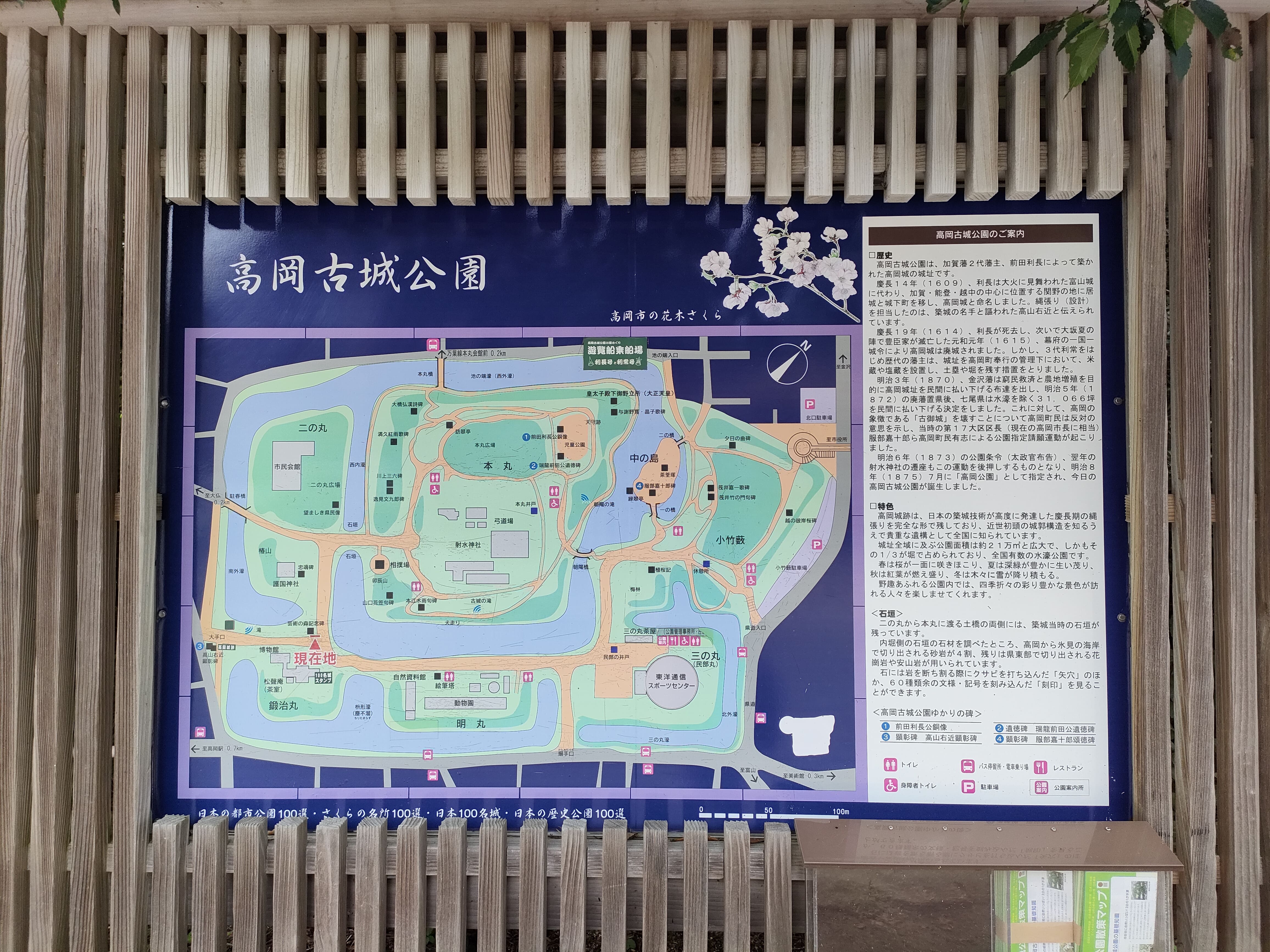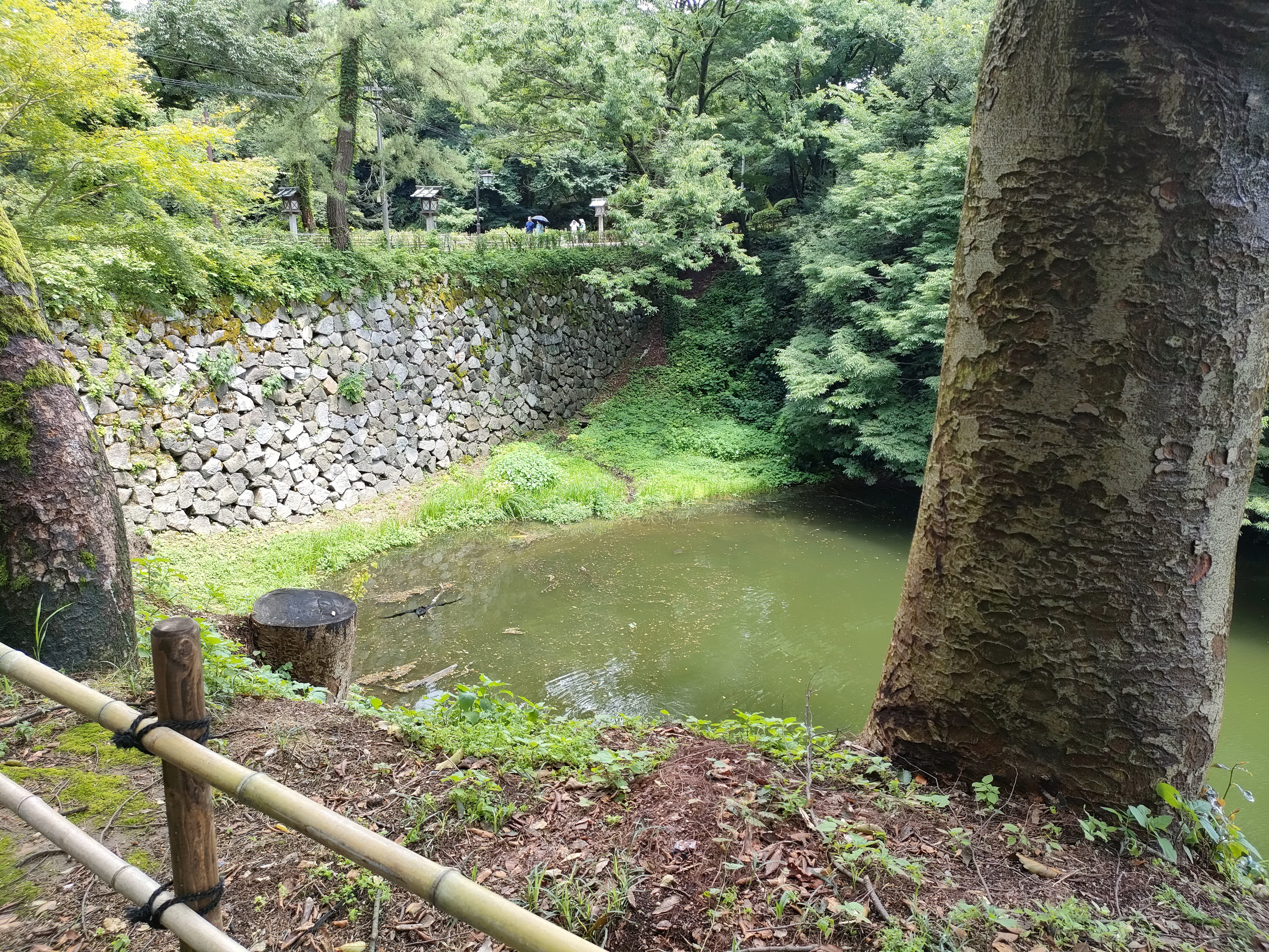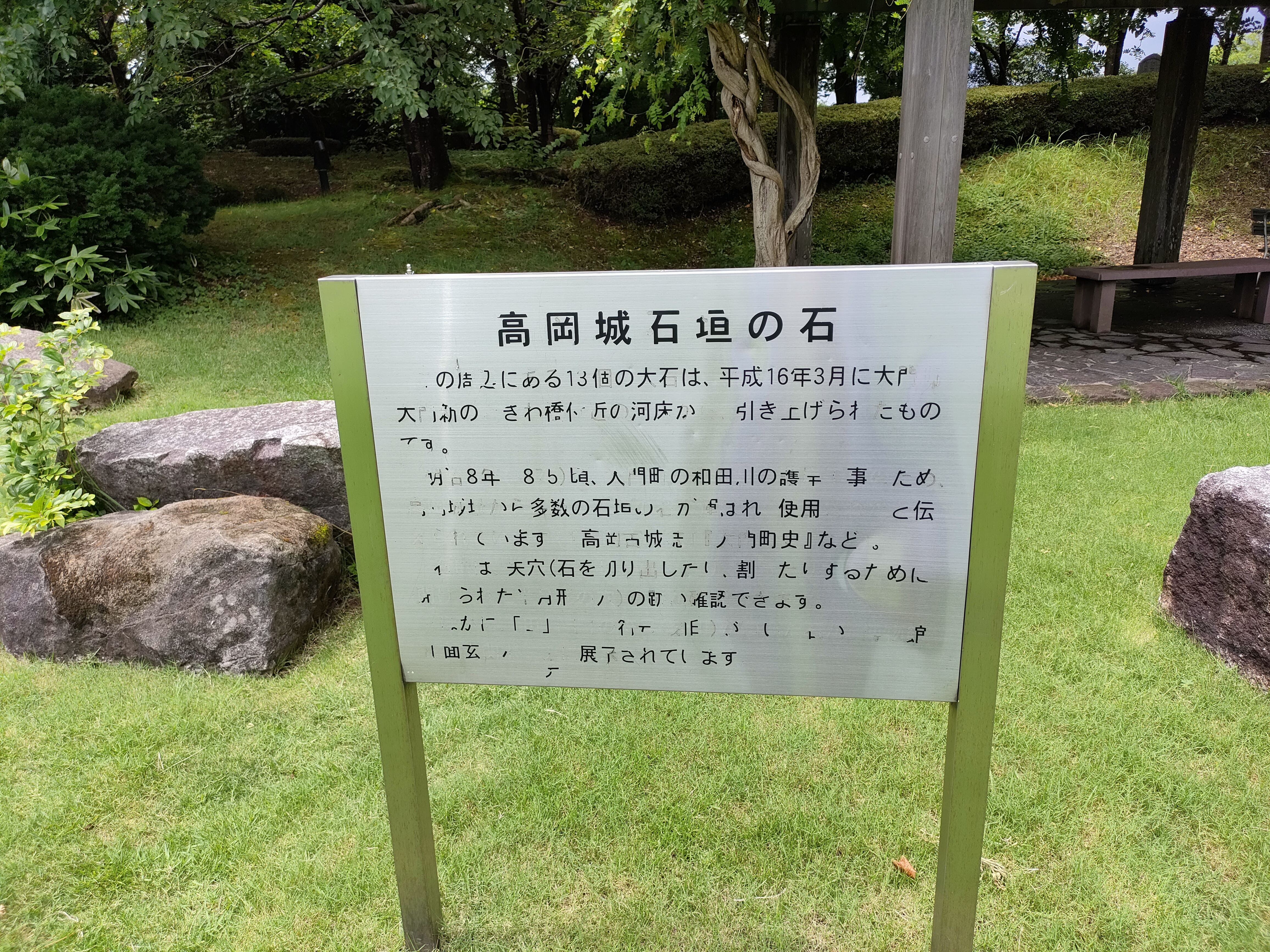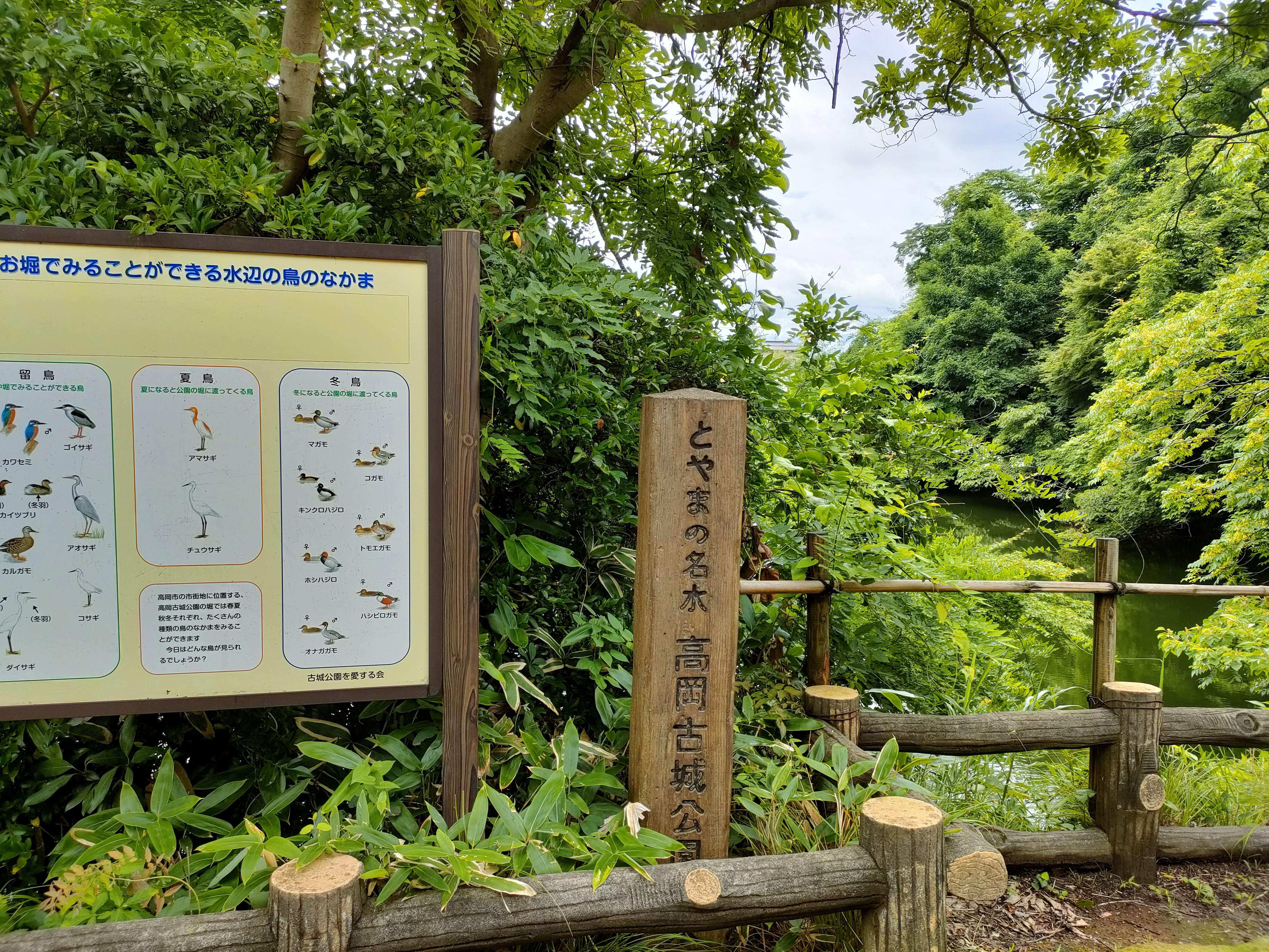 まずは、公園内にある高岡市立博物館を目指しました。駐車場に車を停め博物館内でお勉強。そして公園内を散歩しました。天守はありませんが、堀の立派さには目を見張るものがありました。緑に覆われて堀が隅々まで見られるスポットがなかなありませんでしたが、迫力満点でした。公園中央に歩を進めると、芝生が一面に敷き詰められた場所が出現。そこには、たくさんの人が休日を楽しんでいました。憩いの場所なんですね。