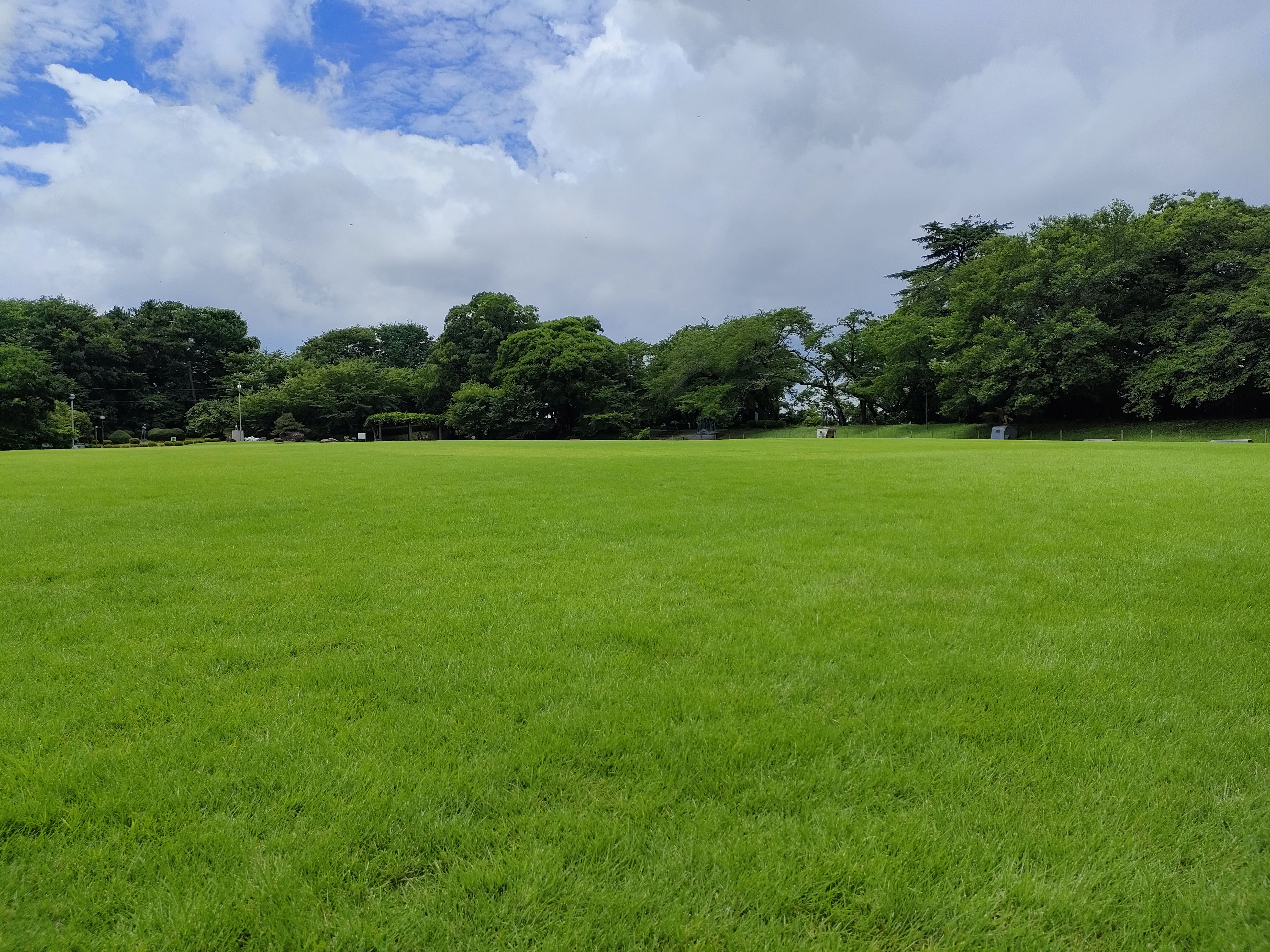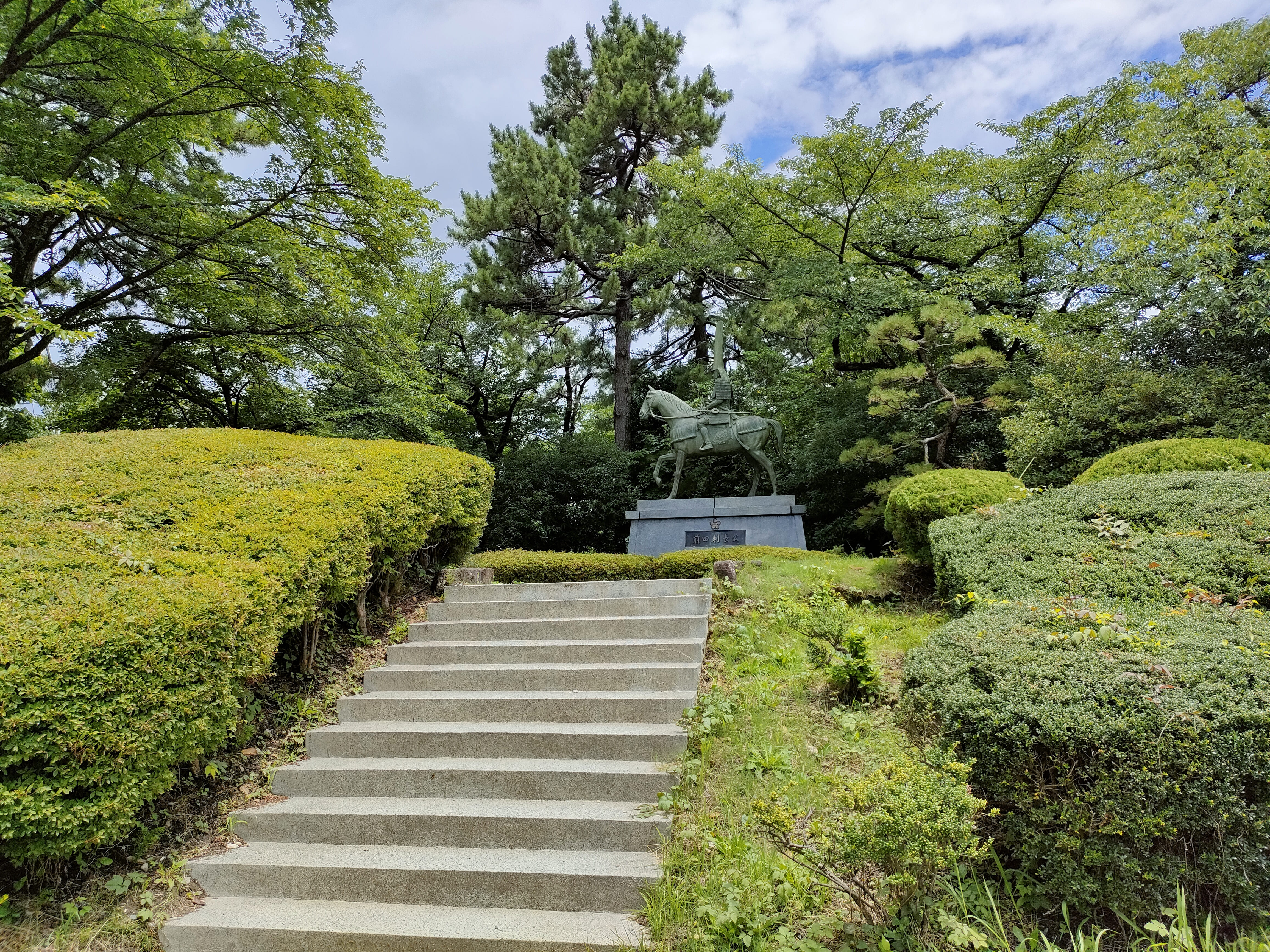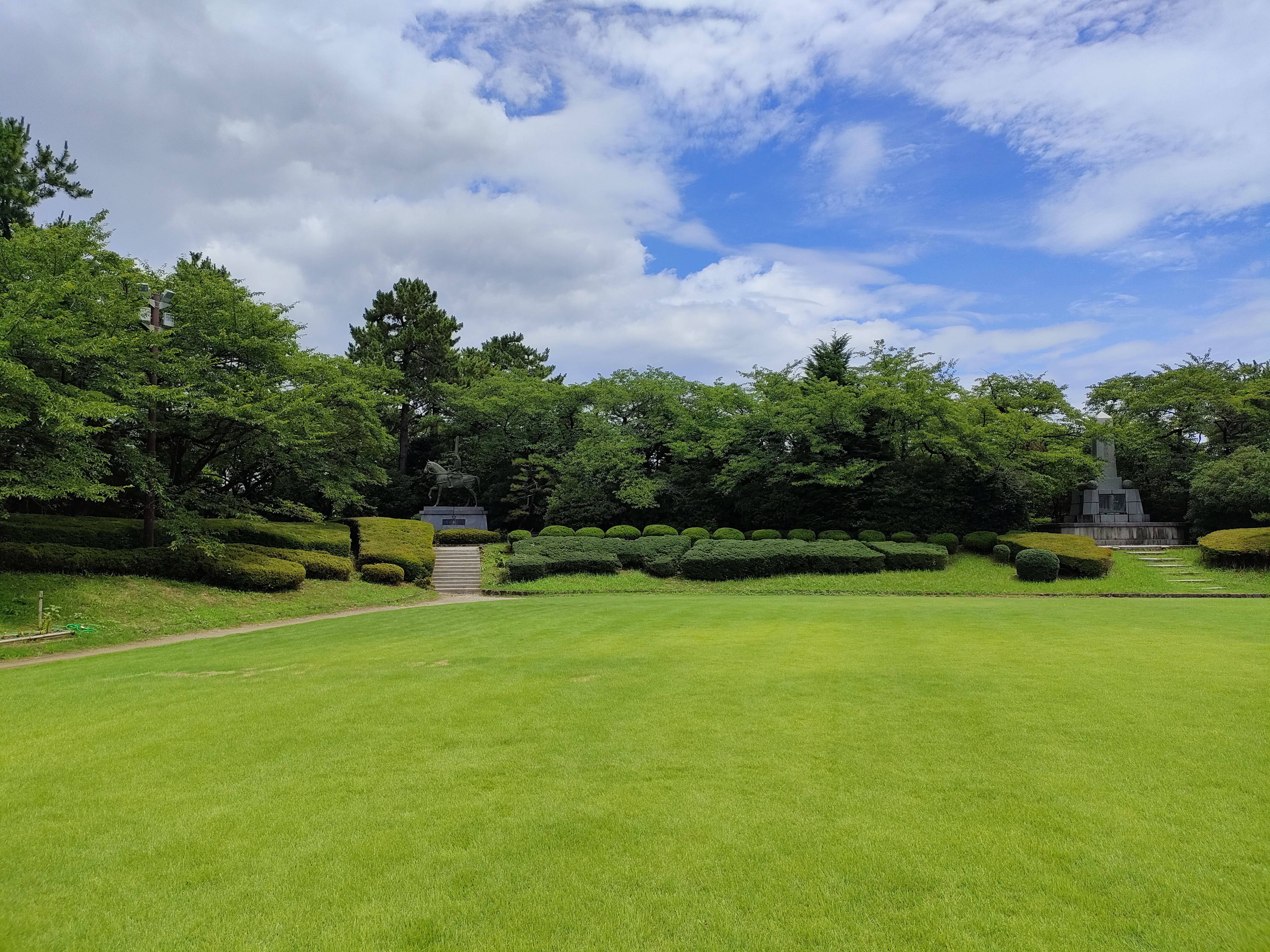 利長公の銅像を見て、そのまま本丸広場へ。芝生がきれいに手入れされていました。雲は多かったのですが、空の青さとの対が、清涼感満載な感じでした。